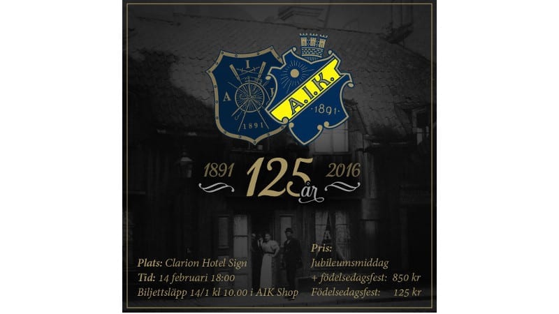 De som väljer att delta på födelsedagsfesten är välkomna från kl 21.00 och biljetterna kostar enbart 125 kr. Köp din biljett till födelsedagsfesten i AIK-shop på Dalvägen 30, Solna. Biljetter säljs också under träningsmatchen mot Norrköping på Skytteholm söndag 14/2.